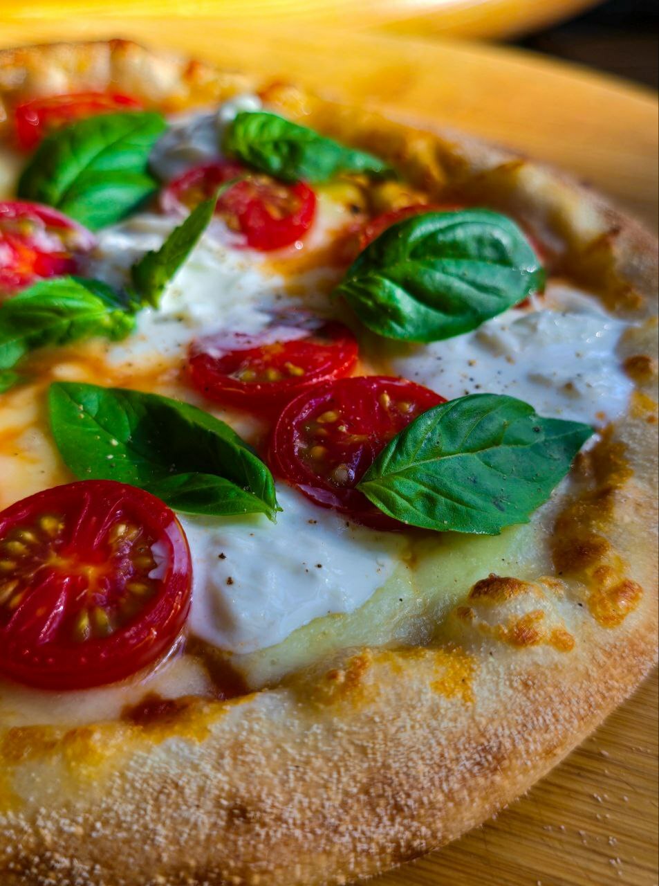 Соус из перетертых томатов, моцарелла, страчателла, помидоры черри, базилик
